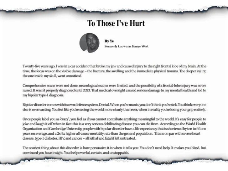 In the ad, Ye blames the car crash that nearly took his life 25 years ago for causing undiagnosed damage to his frontal-lobe, which he says affected his mental health and led to his bipolar type-1 diagnosis.